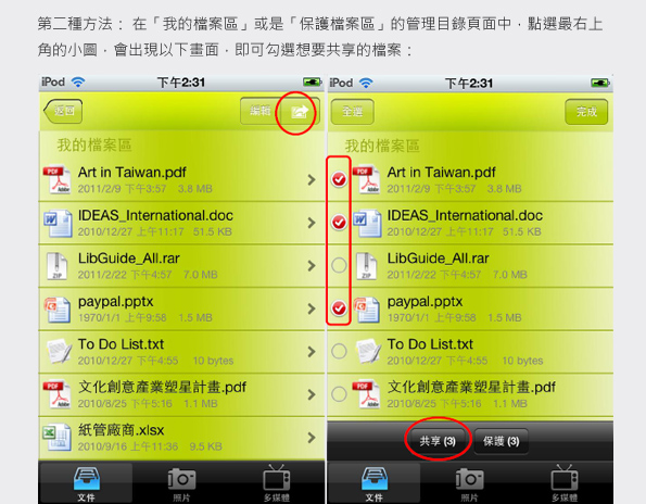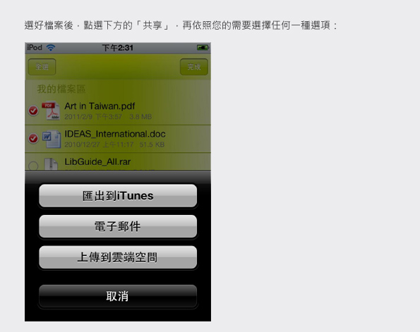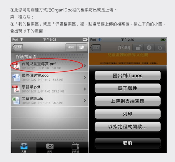 如何把OrganiDoc的檔案上傳到Google文件、Dropbox和以電子郵件寄出?