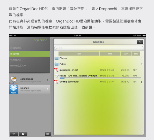 如何把Dropbox裡的檔案下載到OrganiDoc HD裡?